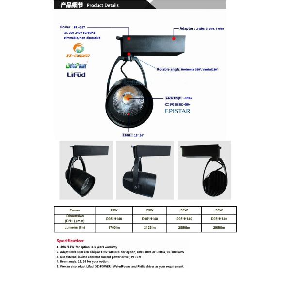 AC230V 2700K-6500K 15W-40W black/white LED track light with 12°15°24° lens in shop spotlight Images |